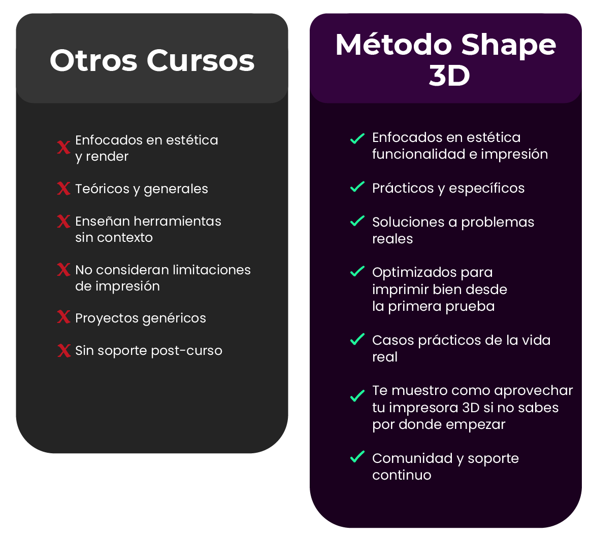 A diferencia de otros cursos que enseñan diseño general, Shape 3D está 100% orientado a crear piezas funcionales, precisas y listas para imprimir.